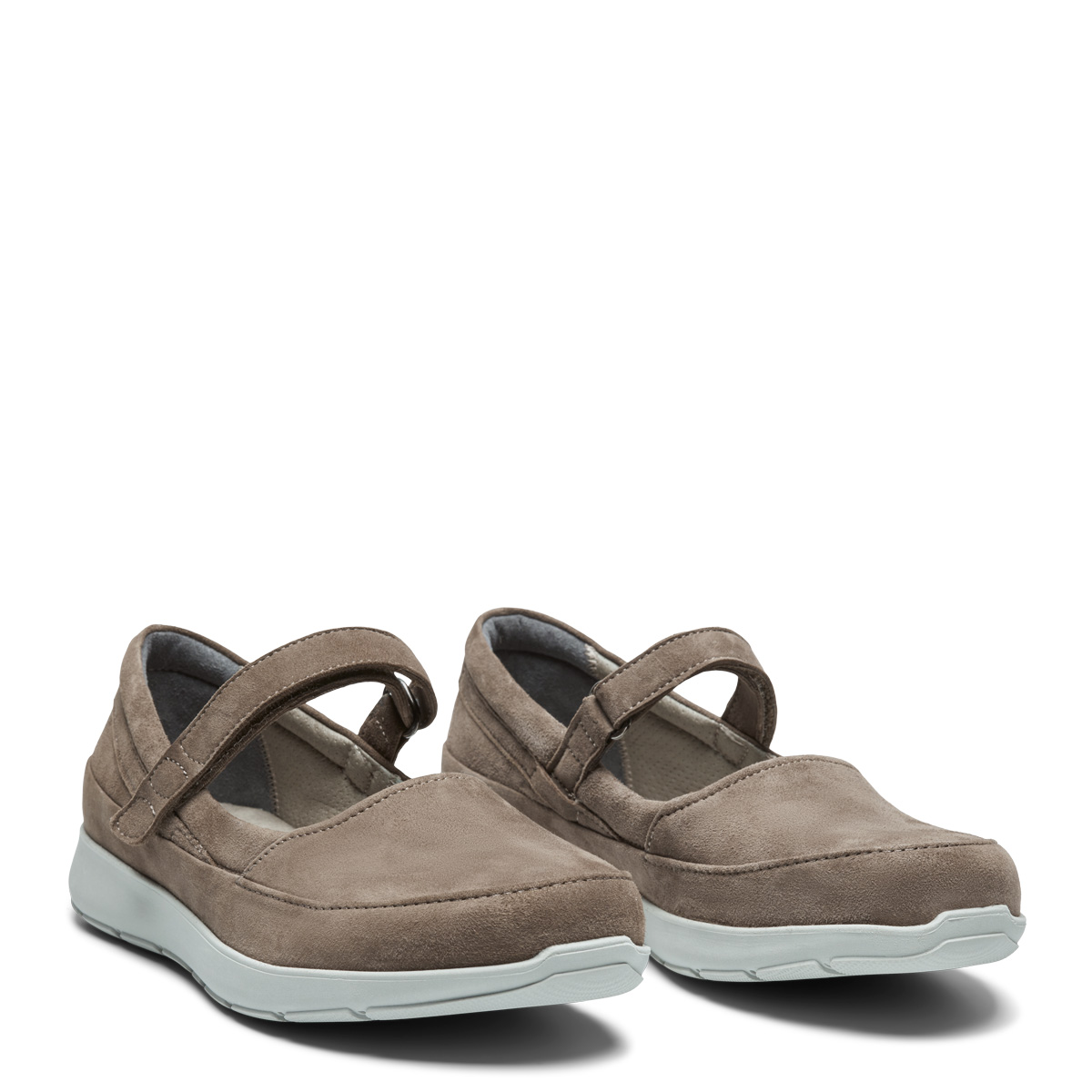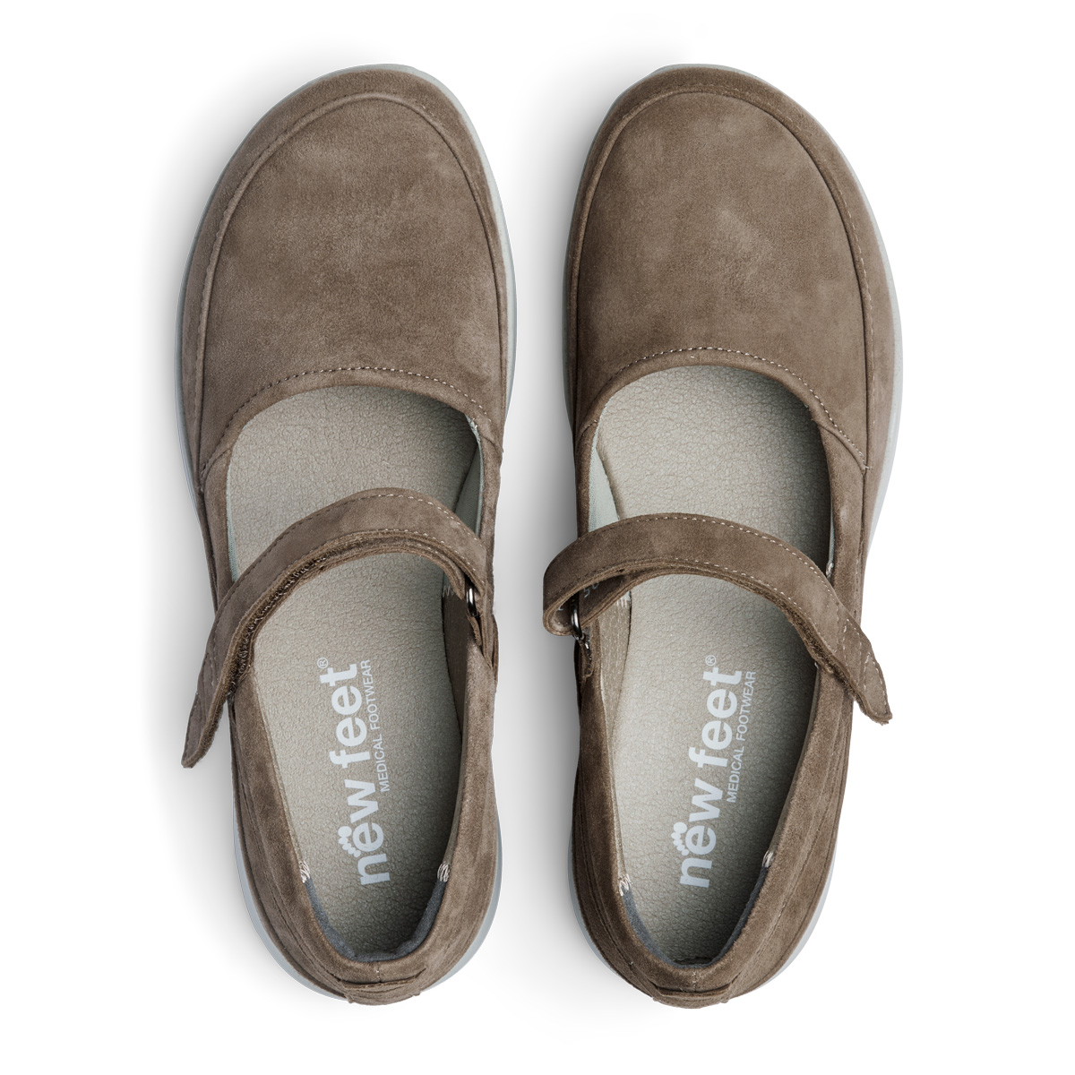 Ballerina with velcro strap. Nubuck. Outer sole in TR with light rocker function. Removable 6 mm shock absorbing Protektor® insole.