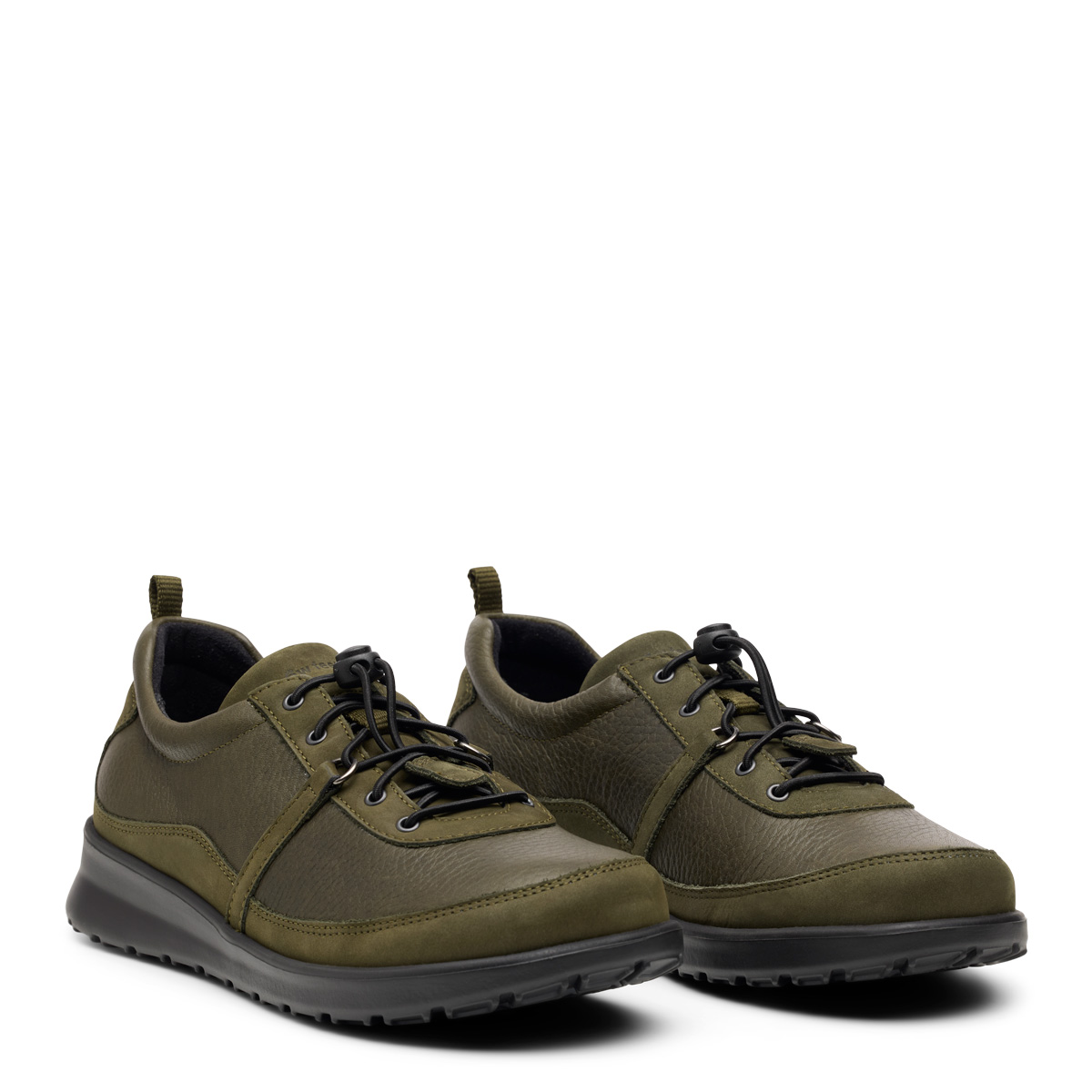 Shoe with elastic lace. Plain leather. Outersole in EVA. Heel lift 25 mm - drop 15 mm. Removable 6 mm shock absorbing Protektor® insole.