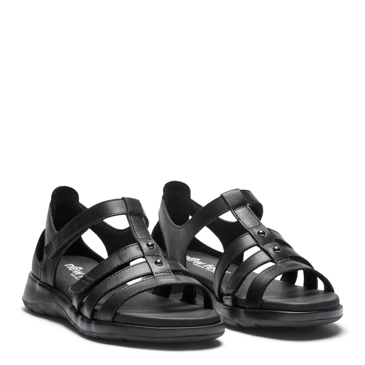 Sandal made of plain leather, with a semi-open heel cap and two Velcro straps for adjusting the fit. The outer sole is made of EVA with a medium rocker function. Inside the shoe is a removable 6 mm shock-absorbing Protektor® insole, providing excellent comfort.