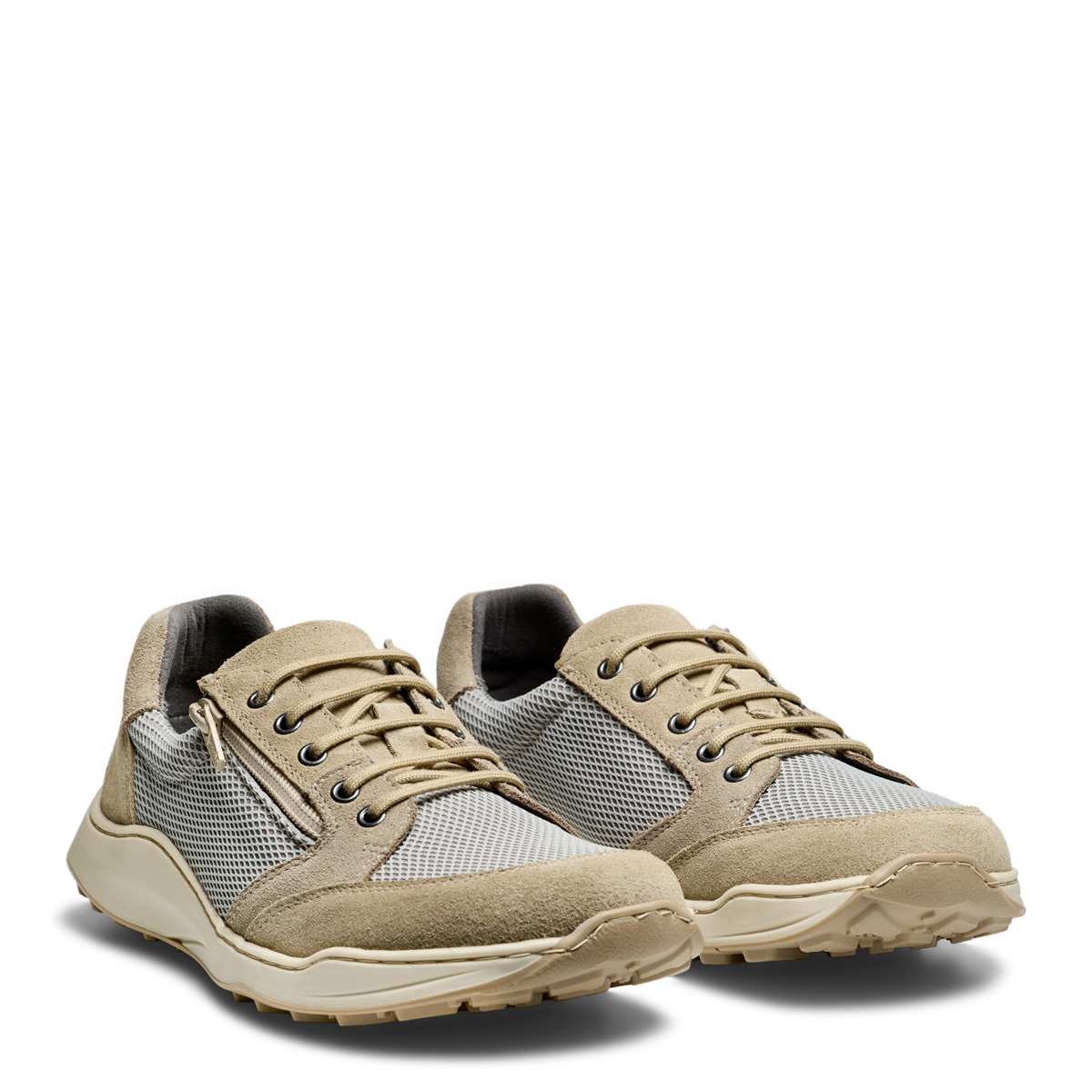 Women's shoe with lace and zip made of mesh and suede. The shoe is designed with a wide toe box and a comfortable, breathable textile lining. The outer sole is made from TR material, providing a stable and secure grip. Inside the shoe is a removable 6 mm shock-absorbing Protektor® insole for optimal comfort and support